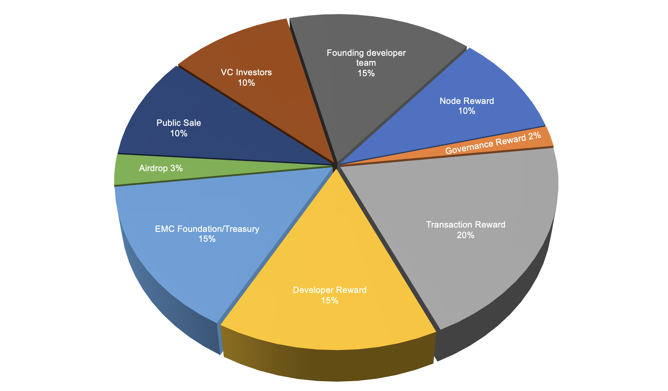 <table><thead><tr><th width="231">分类</th><th width="157">数量</th><th width="78">占比</th><th>释放期限</th></tr></thead><tbody><tr><td>生态奖励-节点奖励</td><td>100,000,000</td><td>10%</td><td>根据奖励合约自动执行</td></tr><tr><td>生态奖励-开发者奖励</td><td>150,000,000</td><td>15%</td><td>根据奖励合约自动执行</td></tr><tr><td>生态奖励-交易奖励</td><td>200,000,000</td><td>20%</td><td>根据奖励合约自动执行</td></tr><tr><td>生态奖励-治理奖励</td><td>20,000,000</td><td>2%</td><td>根据奖励合约自动执行</td></tr><tr><td>空投-顾问及早期贡献者</td><td>30,000,000</td><td>3%</td><td>6个月线性释放</td></tr><tr><td>VC及机构投资者</td><td>100,000,000</td><td>10%</td><td>锁定期12个月，第13-24个月线性释放</td></tr><tr><td>公开发售</td><td>100,000,000</td><td>10%</td><td>-</td></tr><tr><td>EMC基金会</td><td>150,000,000</td><td>15%</td><td>其中1亿枚锁定期12个月，第13-36个月线性释放</td></tr><tr><td>创始团队</td><td>150,000,000</td><td>15%</td><td>锁定期12个月，第13-30个月线性释放</td></tr><tr><td>总计</td><td>1,000,000,000</td><td>100%</td><td></td></tr></tbody></table>