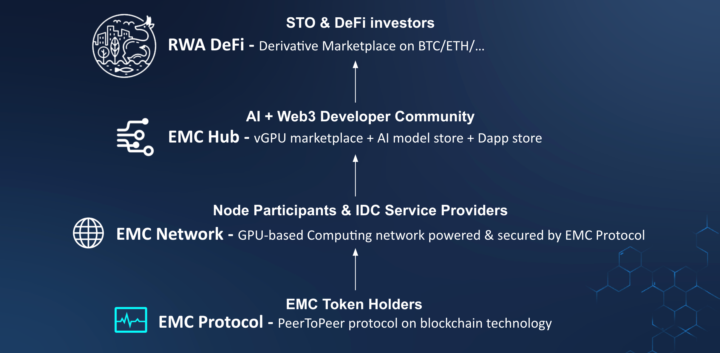 The EMC ecosystem is divided into four layers from bottom to top: protocol layer, network layer, application layer, and asset layer. The EMC hub is the third layer architecture (application layer), providing developers with more user-friendly development tools and an application marketplace.